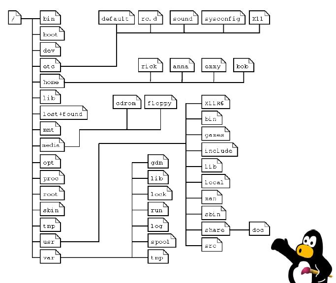 Podczas instalacji Linuksa tworzona jest struktura folderów na dysku lub dyskach zainstalowanych w komputerze. Podstawowa struktura katalogów jest dość ściśle określona wg standardu FHS (z ang. Filesystem Hierarchy System). Oficjalna strona standardu: https://www.pathname.com/fhs/